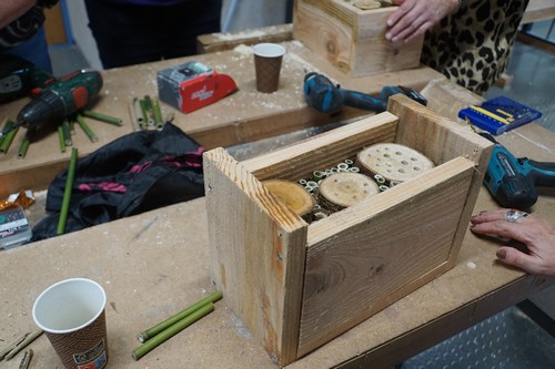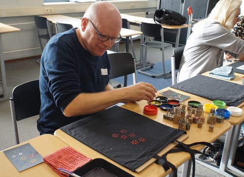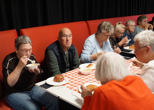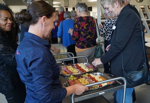 De workshopleiders en de studenten staan klaar om de mantelzorgers mee te nemen naar de verschillende locaties. Voorzien van koffie met een bonbon, starten de workshops: kerstkaarten maken, schoonheidsbehandeling, bloemschikken, antiek herkennen, muziek maken, taartjes bakken, dansende verf, lichtbloemen maken, werken met de natuur, complementaire zorg, Staphorster stipwerk, insectenhotel maken, en langs de voart. Rond twaalven druppelen de deelnemers de Meat & Eat weer in. Gezellig napraten over de creatieve brouwsels en over de ervaringen. Intussen verzorgen de studenten de inwendige mens met rijk belegde broodjes, saucijzen- en kaasbroodjes, soep en sap of zuivel en water.