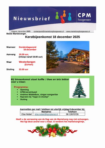 Uitnodiging Kerstbijeenkomst 18 december 2025 02.12.2025 2025 - NIEUWSBRIEF - kerstbijeenkomst - december 2025.pdf Print Mail Reageer
