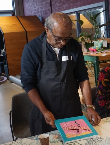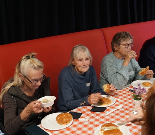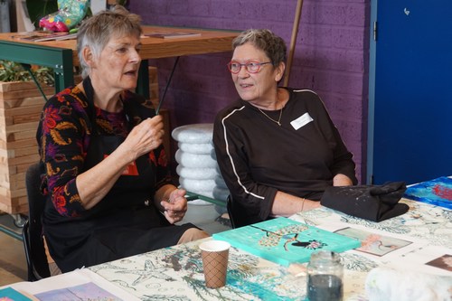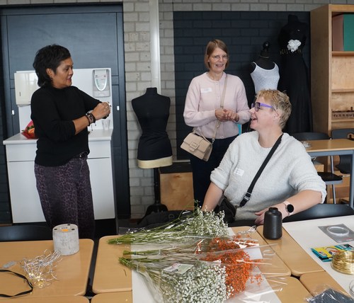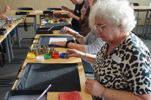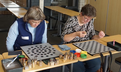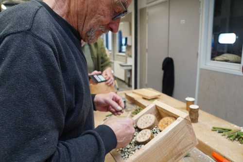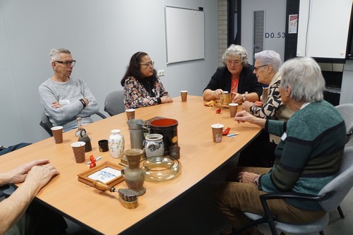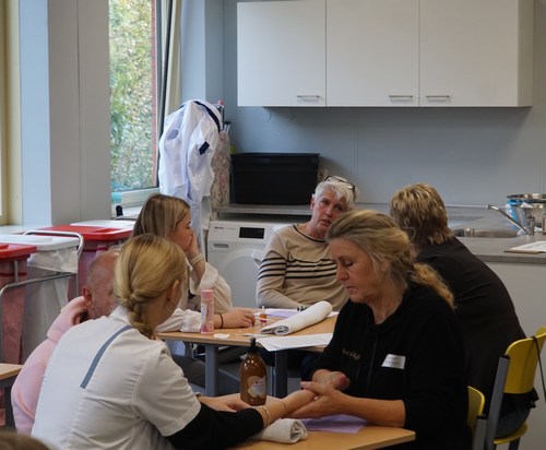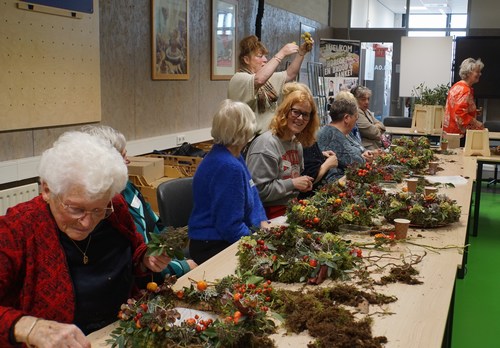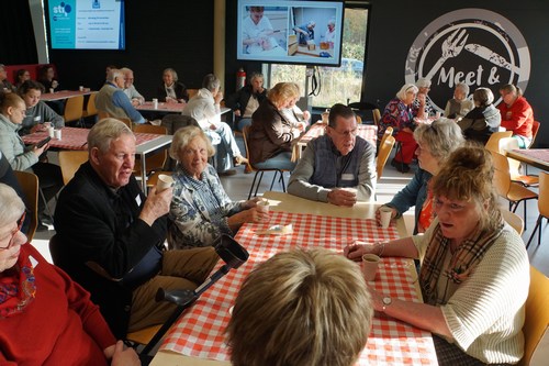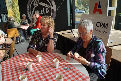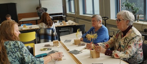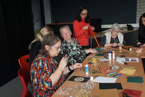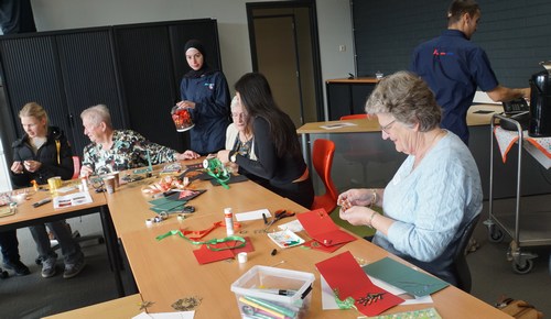 De workshopleiders en de studenten staan klaar om de mantelzorgers mee te nemen naar de verschillende locaties. Voorzien van koffie met een bonbon, starten de workshops: kerstkaarten maken, schoonheidsbehandeling, bloemschikken, antiek herkennen, muziek maken, taartjes bakken, dansende verf, lichtbloemen maken, werken met de natuur, complementaire zorg, Staphorster stipwerk, insectenhotel maken, en langs de voart. Rond twaalven druppelen de deelnemers de Meat & Eat weer in. Gezellig napraten over de creatieve brouwsels en over de ervaringen. Intussen verzorgen de studenten de inwendige mens met rijk belegde broodjes, saucijzen- en kaasbroodjes, soep en sap of zuivel en water.
