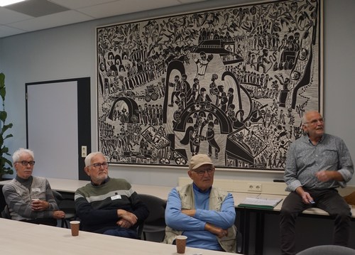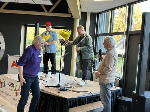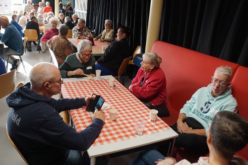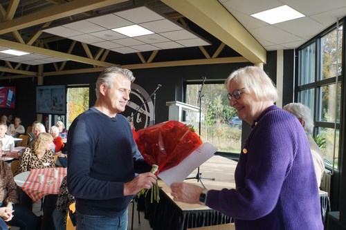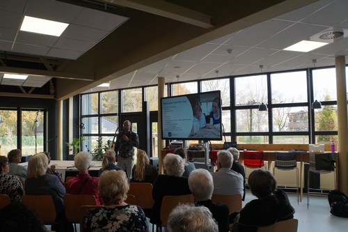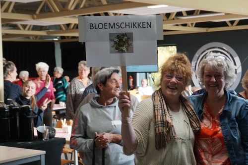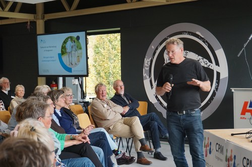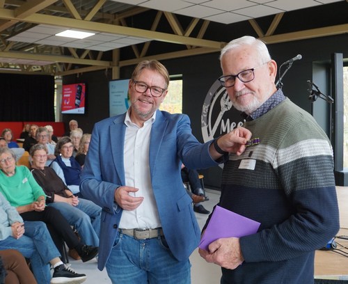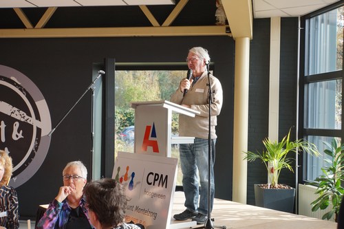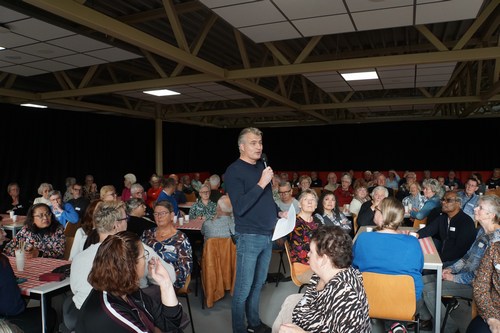 Genoten van een heerlijke lunch, klaar voor het vervolg! Wethouder Derk Reneman opent het middagprogramma, hij spreekt de waardering uit voor de mantelzorgers, maar ook de vrijwilligers die deze dag mogelijk maken. Hij reikt het eerste mantelzorglintje uit aan Goos Werkman.Het blok over de toekomst van de mantelzorger in Hoogeveen/ Drenthe start met een interactieve inleiding van Marius Klein. Waarna Martin Bakker van CMO-stamm de uitkomsten van de overleggen van verschillende geledingen met ons deelt. Als vervolg wordt de mantelzorgers gevraagd om de puntenlijsten die uitgedeeld worden in te vullen. Dit om een goed beeld te krijgen, wat de mantelzorger als ondersteuning in de toekomst wenst c.q. behoefte aan heeft.